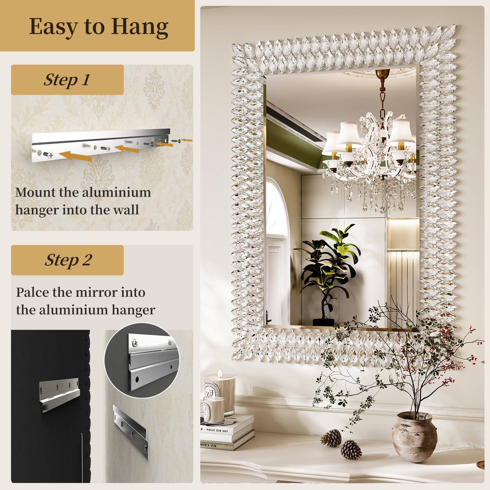 - Luxuriöse Diamanten. Bis zu 200 Stück funkelnde Diamanten werden verwendet, um den Spiegel sowohl elegant als auch luxuriös aussehen zu lassen. Jeder Diamant wird sorgfältig ausgewählt, um sicherzustellen, dass jeder von ihnen perfekt und ohne Fehler ist. Die Diamanten um diesen Spiegel reflektieren das Licht in verschiedenen Farben. Sie schimmern und leuchten den ganzen Tag und die Nacht, was dem Spiegel einen zusätzlichen Touch und Glamour verleiht. Der Spiegel ist ideal für Mädchenzimmer, Schrank, Make-up-Bereich, Kaminsims oder überall dort, wo Sie etwas Glanz benötigen.