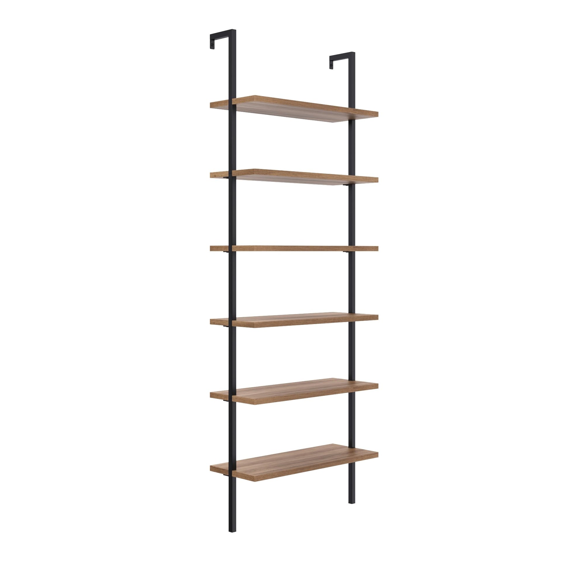 - Dieses 6-stöckige, moderne Bücherregal mit Wandhalterung verschönert jeden Raum mit seinem industriellen Stil aus Holz und Metall.